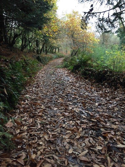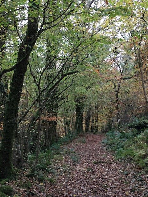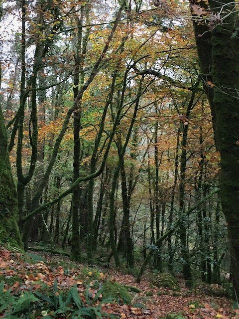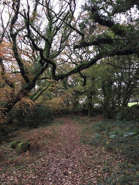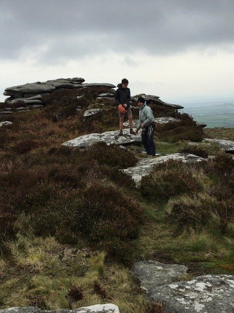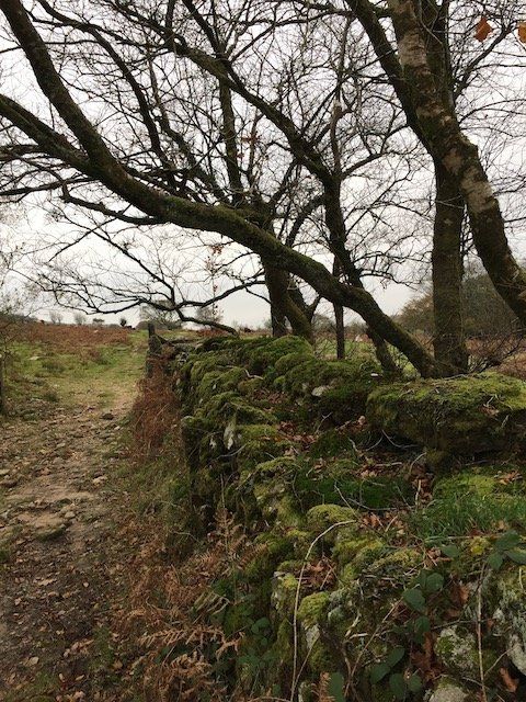 From home across the Lynher valley to follow the lane uphill and onto the moor , to Hawks Tor. Clambering along the granite ridge, I chatted to two climbers as they prepared their ropes to abseil down. Then following the wall, down through the rough to where sheep and cattle graze. Finally following the bridleway down though Castick Wood to the footbridge back over the River Lynher.