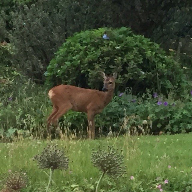Each morning I stand outside in the early morning light. Sometimes I see this roe deer, calmly walking up through the garden, then onto the hedge as it is in this photo, to jump down into the meadow. She's a frequent evening visitor. Update: Here's a lovely article about roe deer https://www.theguardian.com/environment/2020/sep/05/country-diary-roe-deer-buck-the-trend-of-decline
